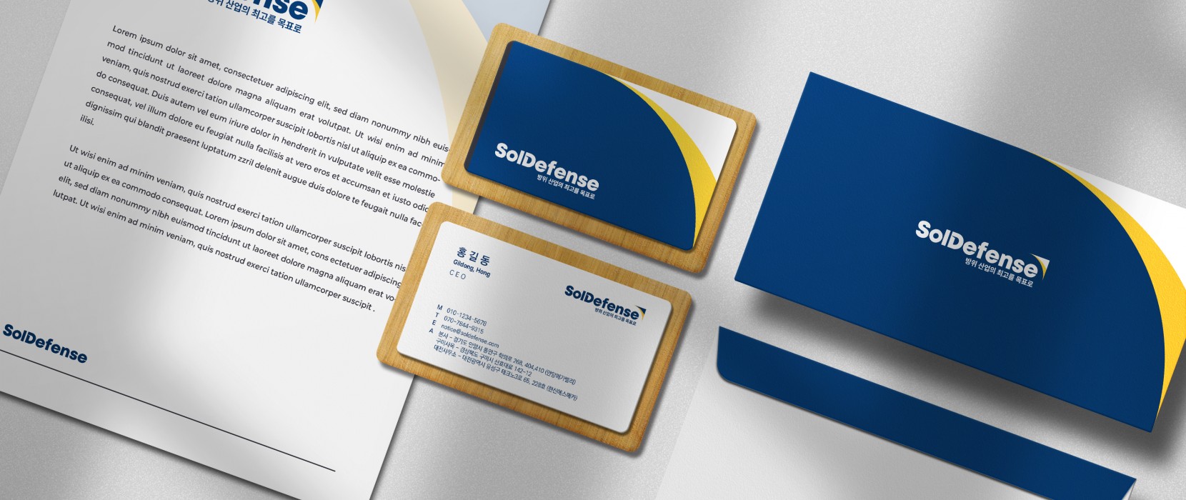 ‘ 방산 기술 발전으로 인한 최고의 방어는 최고의 기술과 국력으로 이어집니다. 솔디펜스 ’ 라는 컨셉을 담아 디자인한 워드마크형 디자인입니다. 단단하고 굳건한 이미지의 볼드한 워드마크 디자인과 방산기술을 통한 방어를 의미하는 그래픽을 함축적으로 표현해 함께 디자인해 넣었습니다. 컬러의 경우 신뢰와 기술력을 의미하는 딥네이비 컬러와 미래지향적인 옐로우 컬러를 조합하였습니다.